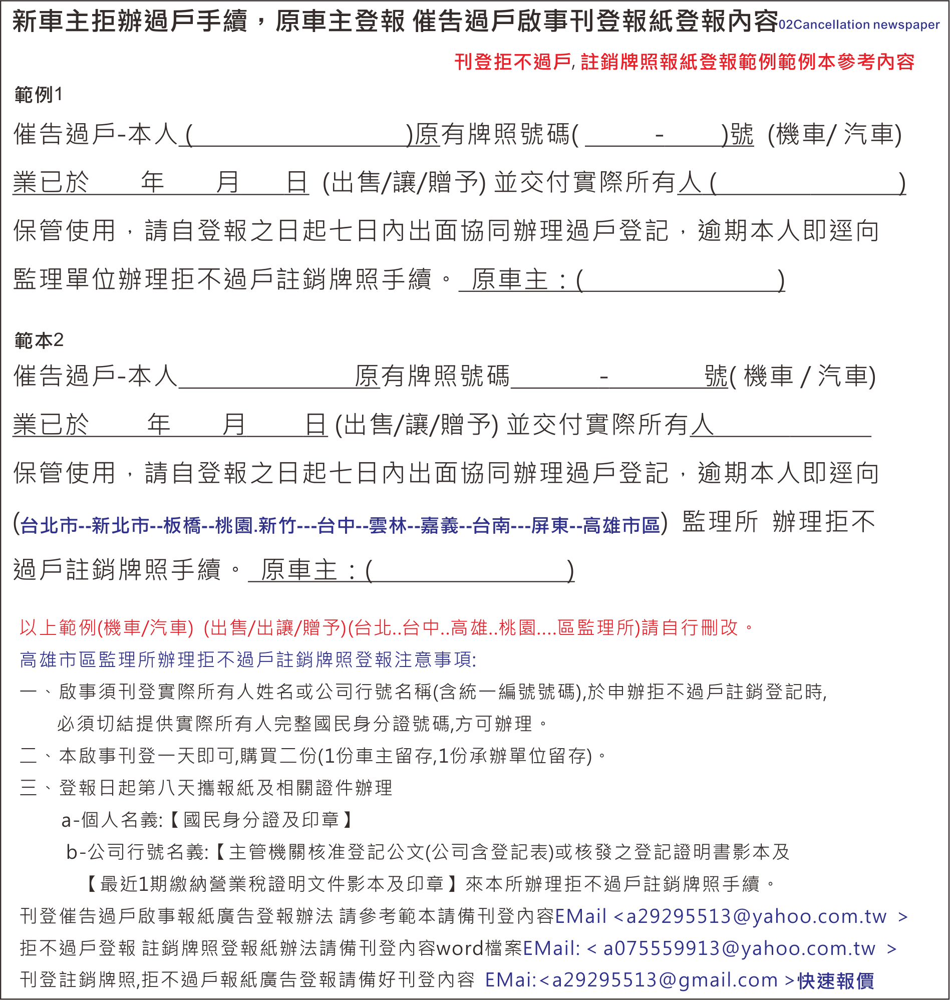 拒不過戶註銷-機車 汽車牌照催告過戶啟事-登報範例範本參考內容