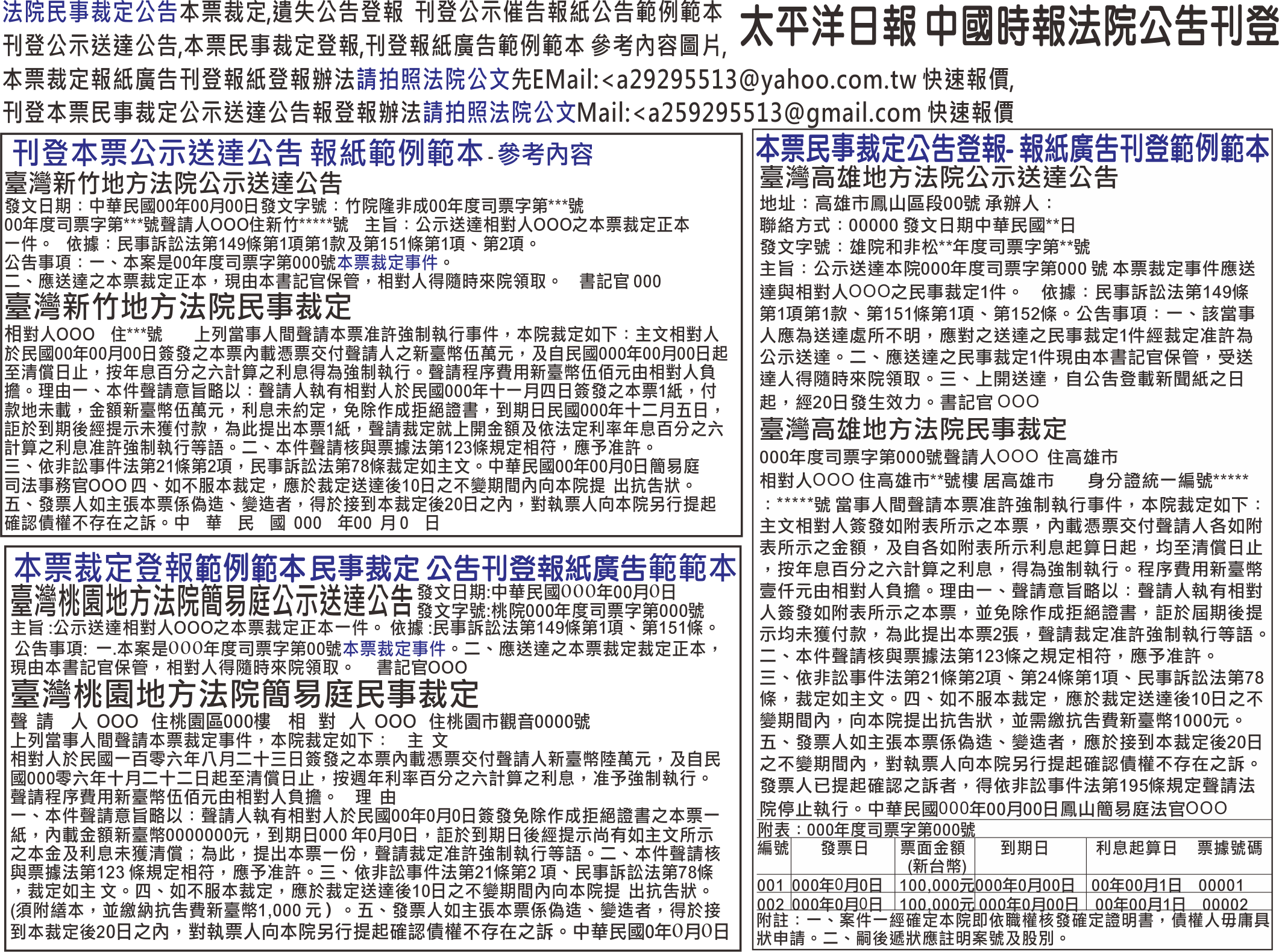 本票裁定登報,刊登全國版及海外版地方法院公告報紙廣告,無論您要登台北,高雄,台北,桃園,基隆,新竹,苗栗,台中,彰化,南投,雲林,嘉義,台南,