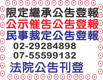 刊登高雄法院公示催告電話(07)5559913      高雄email: < a075559913@gmail.com>