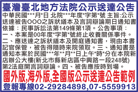 全國版,海外版國外公告,聲請公示送達登報廣告費用如何算,聲請公示送達刊登報紙費用價格要多少錢, 法院公告刊登,   臺北地方法院公告,報紙廣告範例範本